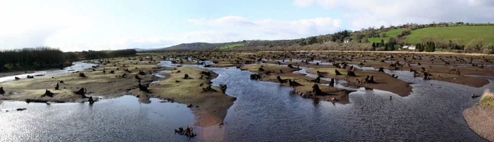 Initially, periodic flooding with huge volumes of melt water generated the mixed deposits of sand, gravel, cobbles and boulders that have been encountered at depth. As the valley became infilled, and as water levels rose, the coarse outwash from the melting glacier was replaced by sand- and gravel-rich sediment deposited initially, in fast-flowing braided streams, and then, by a branching river that flowed down a shallow gradient; also known as an anastomosing river. Thus, in the Late Mesolithic, the valley at Cork may have been similar to the unique, forested floodplain that is preserved at The Gearagh, near Macroom, further upstream. Unfortunately, much the unique environment was drowned in the 1950s, when two dams were built on the River Lee as part of the ESB hydroelectric scheme, so that now only oak stumps and half-submerged channels remain (see featured image). Some idea of the impassable woodland in the upper part of The Gearagh does, however, survive and is shown in the image on the left.